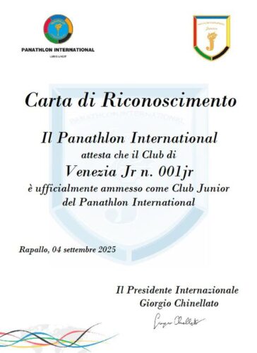 Nella stessa data, giovedì 4 settembre 2025, la Segreteria Generale del Panathlon International ha trasmesso l’atto di riconoscimento ufficiale del Panathlon Club Venezia Junior, con la firma del Presidente Internazionale Giorgio Chinellato.
